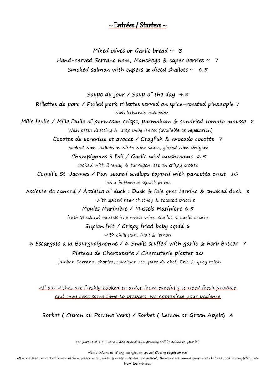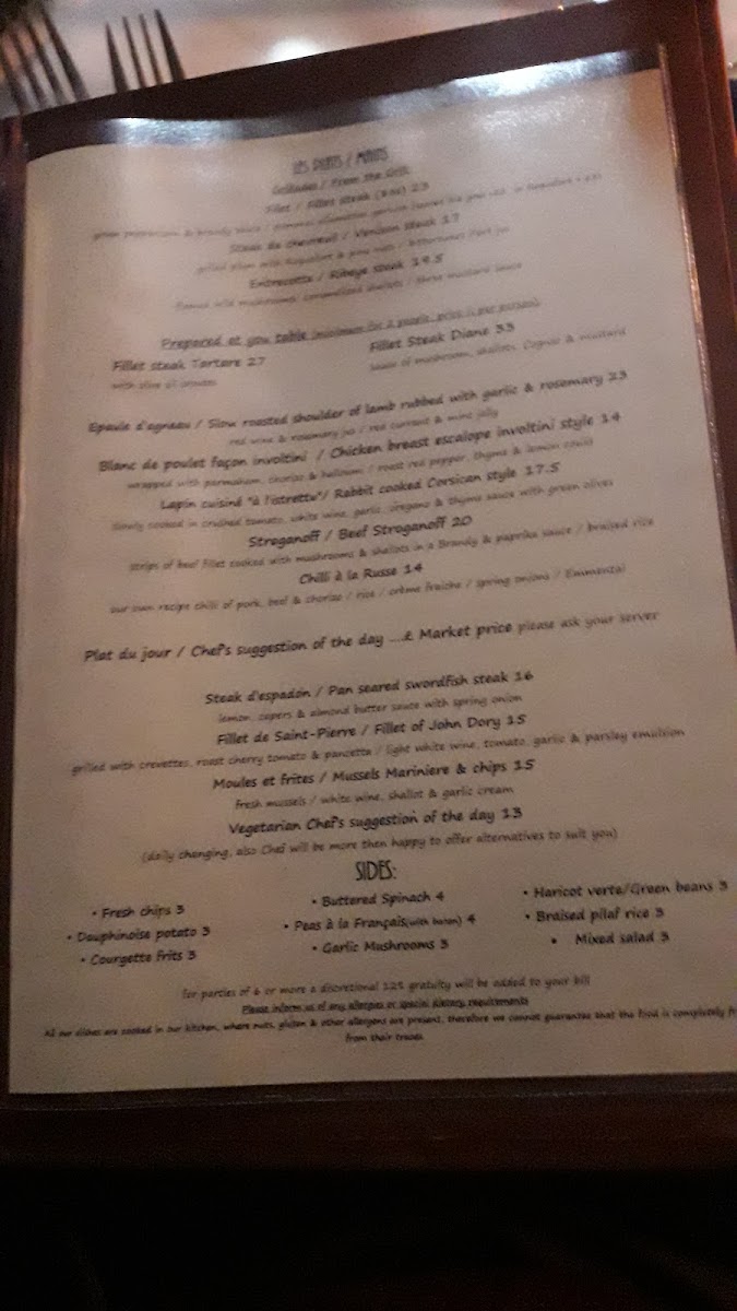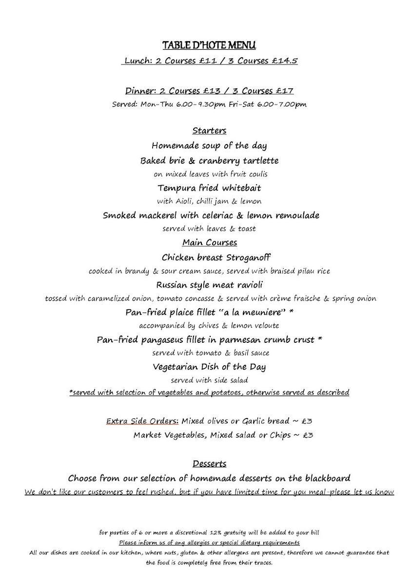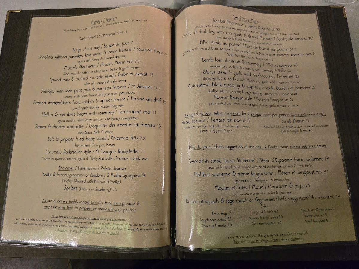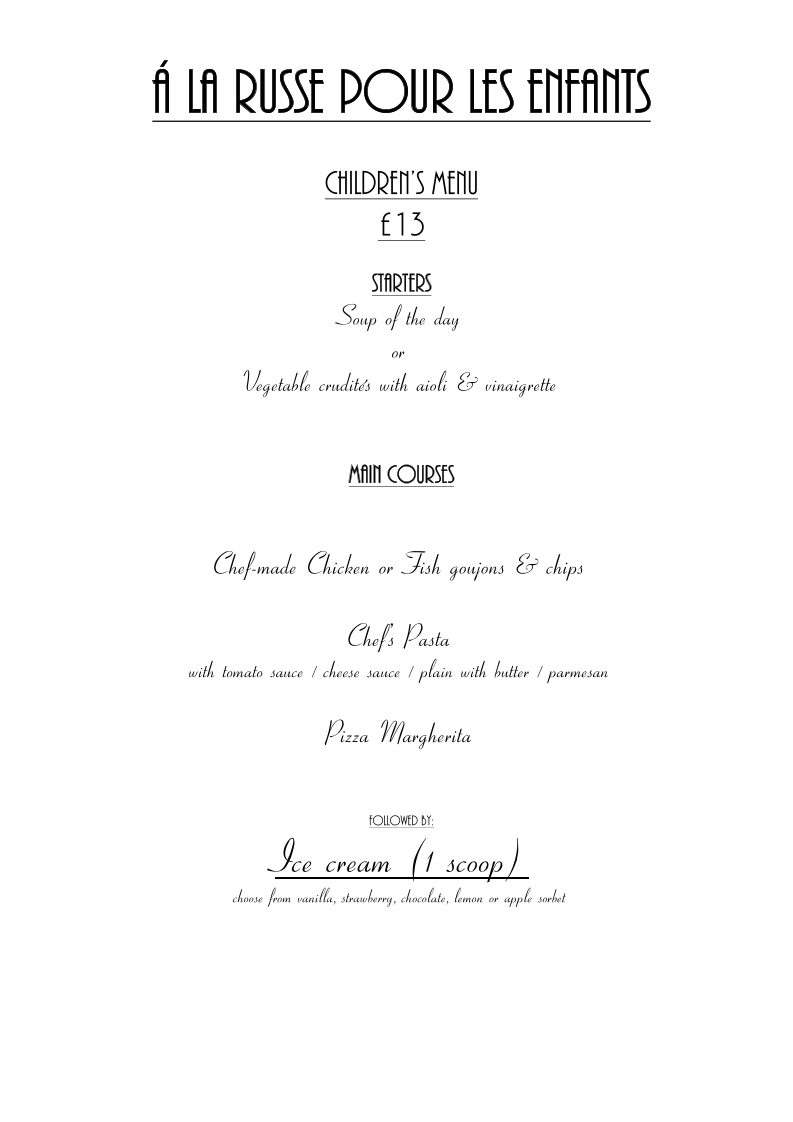From a reviewer’s perspective, the menu at À La Russe offers a refined yet comforting selection that balances classic European flavors with Russian influences. The starters, such as Homemade Soup Of The Day and Baked Brie & Cranberry Tartlette, set a warm tone, while options like Tempura Fried Whitebait and Smoked Mackerel With Celeriac & Lemon Remoulade add variety and sophistication. The main courses stand out with hearty dishes like Chicken Breast Stroganoff and Russian Style Meat Ravioli, alongside elegant seafood choices such as Pan-Fried Plaice Fillet "A La Meuniere" and Pan-Fried Pangaseus Fillet In Parmesan Crumb Crust. Premium offerings under “Les Plats,” including Fillet Steak Au Poivre and Confit Of Duck Leg With Kumquats & Grand Marnier, elevate the experience further. Sides like Courgette Frits and Buttered Spinach complement the mains nicely, while desserts such as Crème Brûleé and Profiteroles With Crème Patissiere provide a classic, indulgent finish. Although prices are not explicitly listed, the breadth of dishes-from Ribeye Steak & Garlic Wild Mushrooms to Swordfish Steak Façon Sicilienne-suggests a menu designed to cater to both casual diners and those seeking a more upscale culinary experience.
