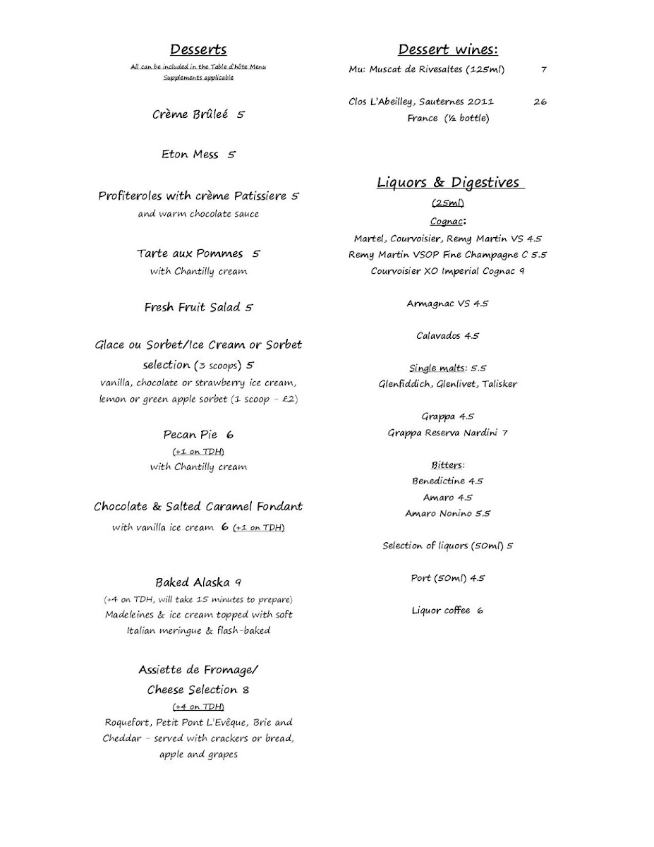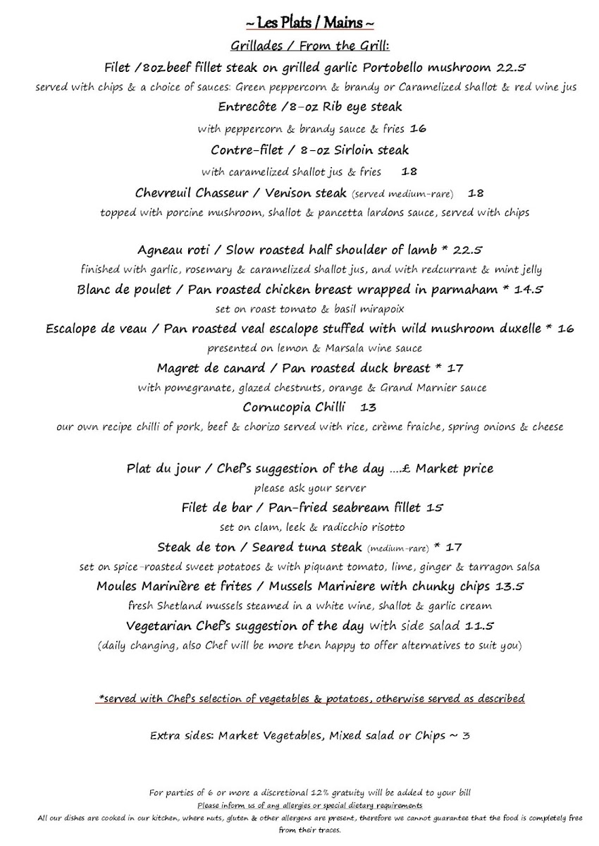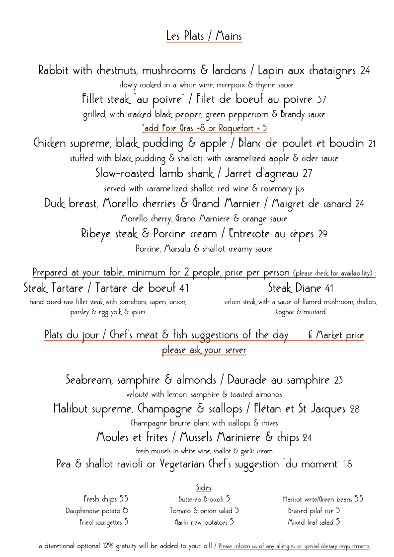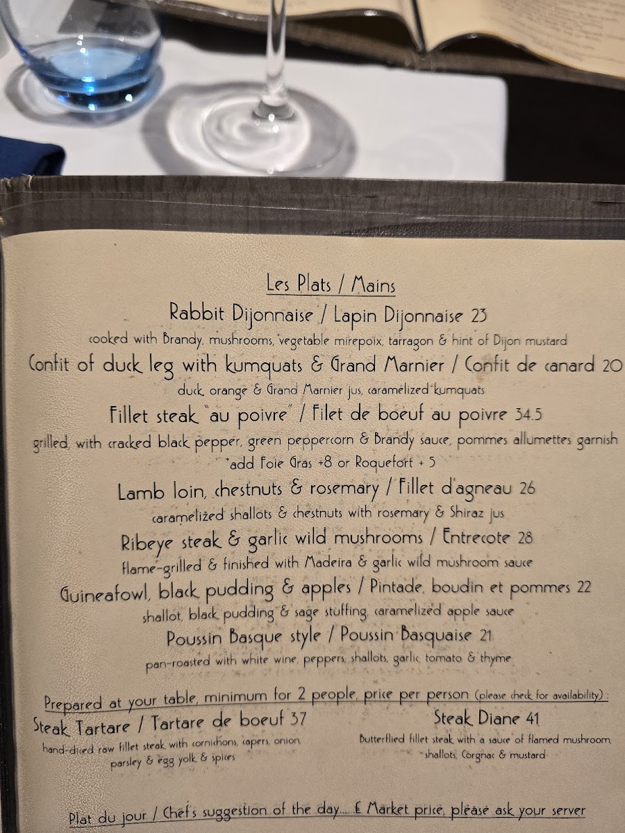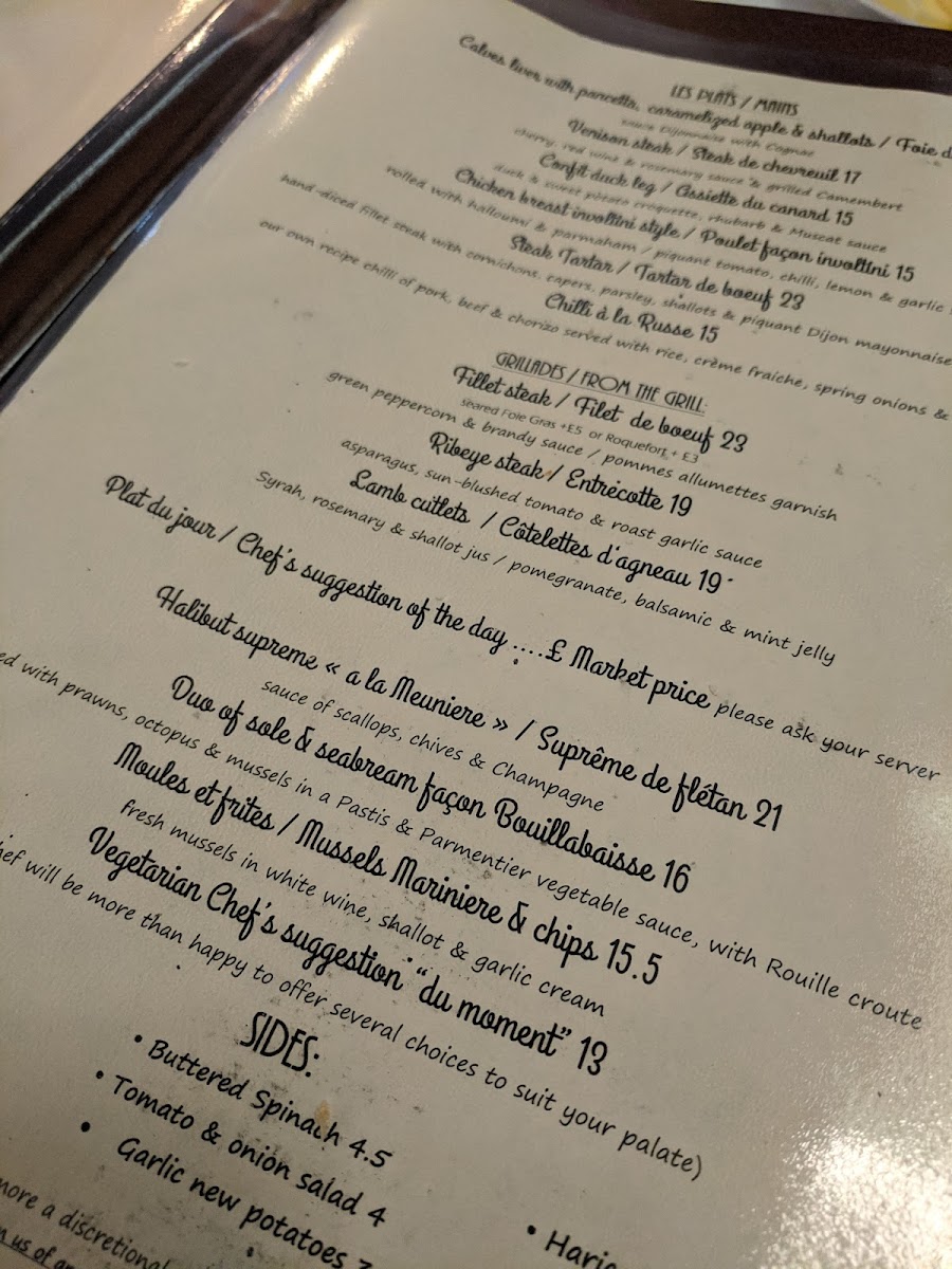 From a reviewer’s perspective, the menu at À La Russe offers a refined yet comforting selection that balances classic European flavors with Russian influences. The starters, such as Homemade Soup Of The Day and Baked Brie & Cranberry Tartlette, set a warm tone, while options like Tempura Fried Whitebait and Smoked Mackerel With Celeriac & Lemon Remoulade add variety and sophistication. The main courses stand out with hearty dishes like Chicken Breast Stroganoff and Russian Style Meat Ravioli, alongside elegant seafood choices such as Pan-Fried Plaice Fillet "A La Meuniere" and Pan-Fried Pangaseus Fillet In Parmesan Crumb Crust. Premium offerings under “Les Plats,” including Fillet Steak Au Poivre and Confit Of Duck Leg With Kumquats & Grand Marnier, elevate the experience further. Sides like Courgette Frits and Buttered Spinach complement the mains nicely, while desserts such as Crème Brûleé and Profiteroles With Crème Patissiere provide a classic, indulgent finish. Although prices are not explicitly listed, the breadth of dishes-from Ribeye Steak & Garlic Wild Mushrooms to Swordfish Steak Façon Sicilienne-suggests a menu designed to cater to both casual diners and those seeking a more upscale culinary experience.